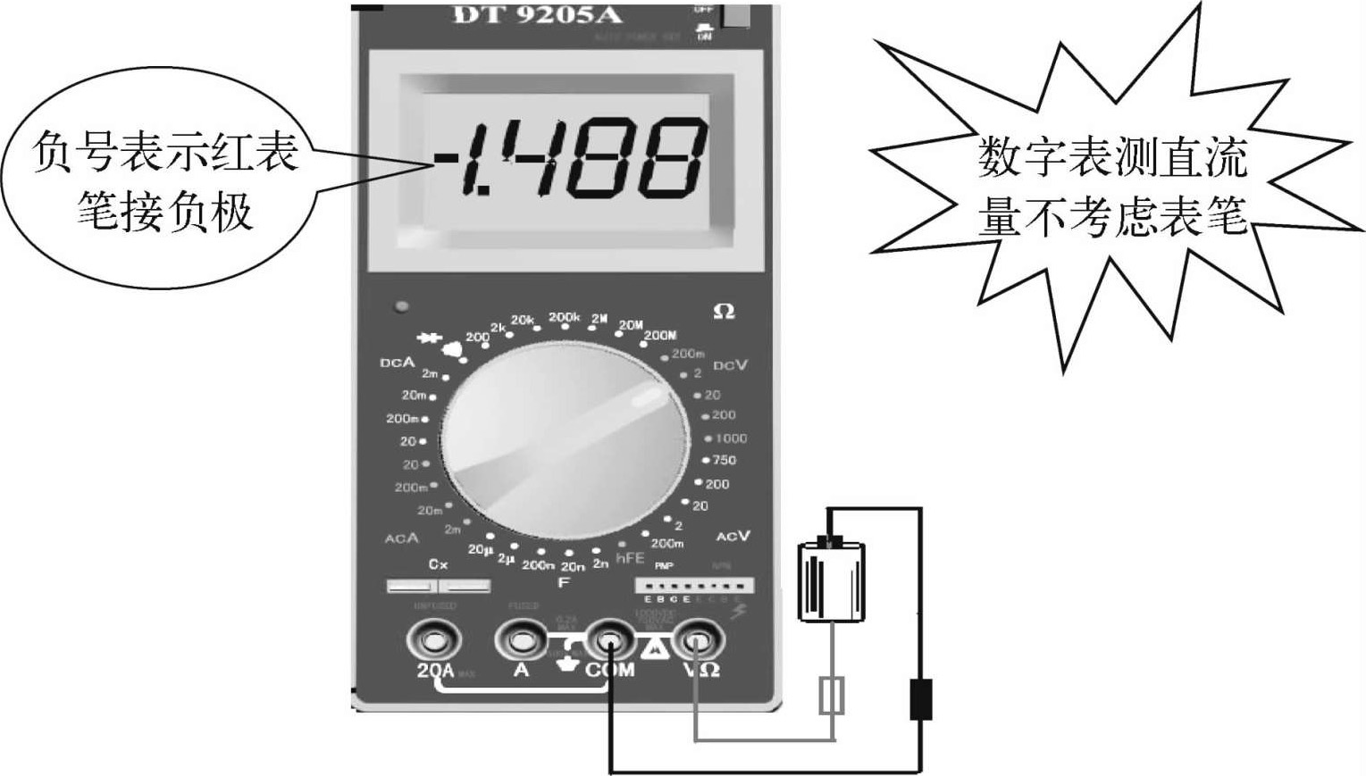 若是表针反向转,接线正负反极性——在测量时,若是表针反向偏转,说明正负极性接反了,应立即交换红、黑表笔的接入位置。