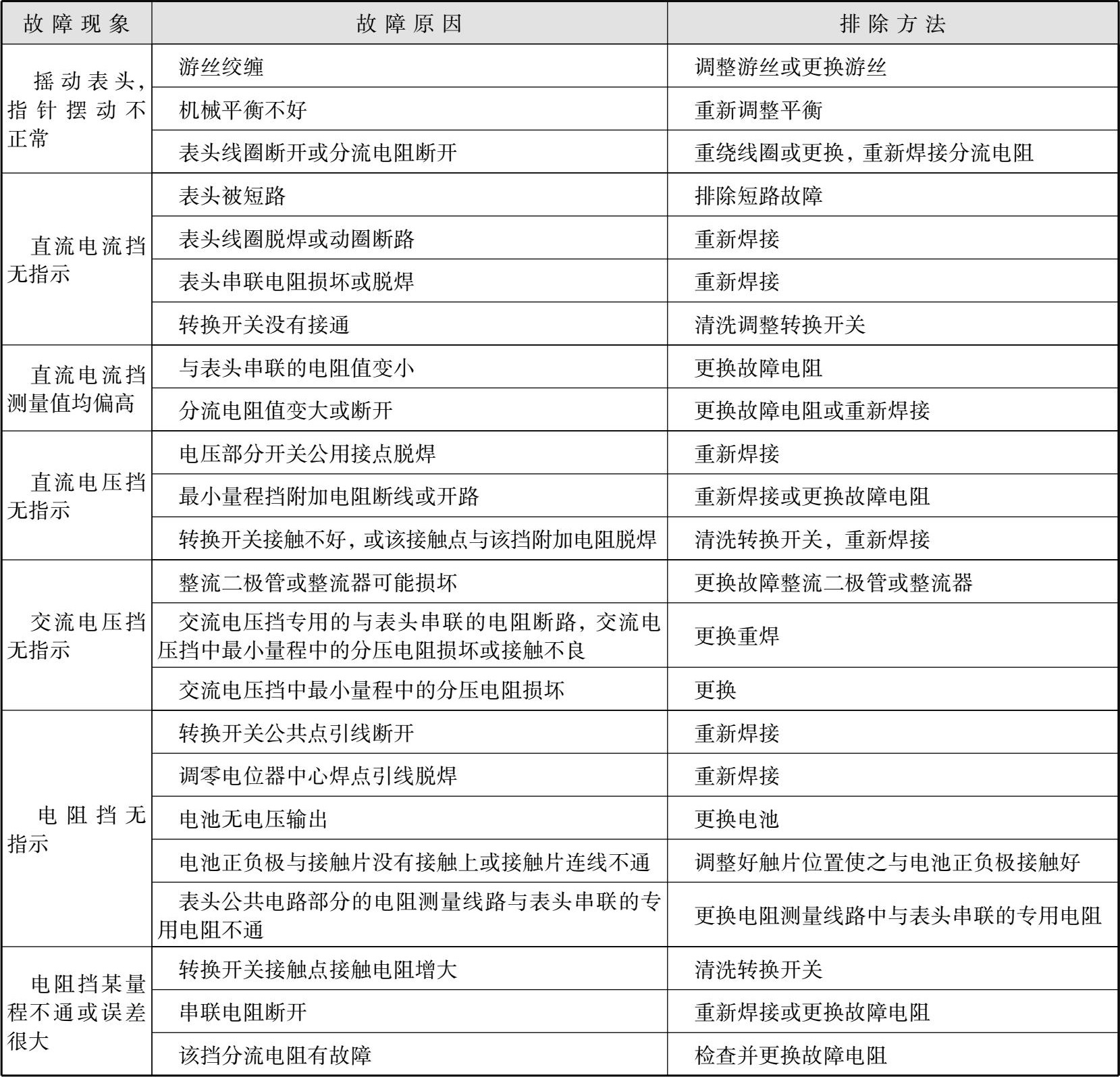 表1-4 指针式万用表常见简单故障及排除方法
