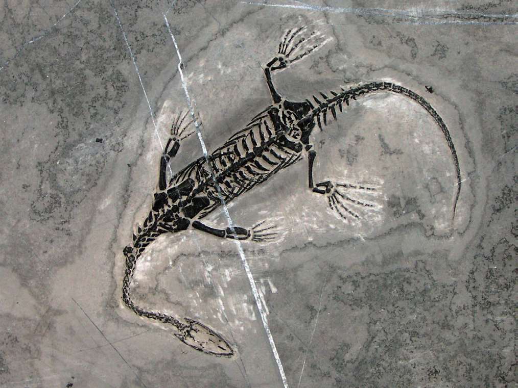 胡氏贵州龙是体长约30厘米的小型水生爬行动物,生存于距今2亿3千多万年前的三叠纪中期,发现于贵州省兴义等地。其主要特征是:四肢尚未退化成鳍脚,脖子细长,便于伸出水面呼吸,可两栖生活,一般活动于海滨地区;眼眶大而圆,头骨三角形,最大宽度在眼眶处,嘴部小而尖。胡氏贵州龙是我国报道的第一个三叠纪水生爬行动物。