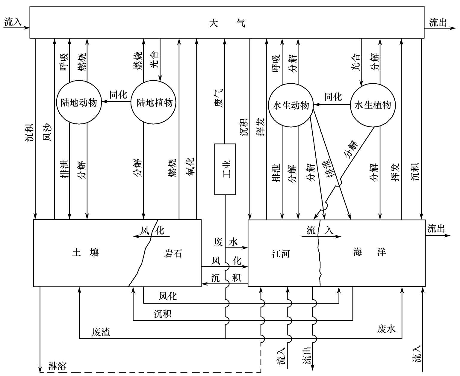(3)有机碳循环是通过生物的细胞级循环(植物的光合作用、动物的呼吸)、植物级循环(植物吸收CO 2 而生长,死亡后分解释放的CO 2 )、食物链循环(植物被动物吞食后转化为动物组织,并沿食物链方式循环)、生物地球化学循环(包括地球生物系统中人类活动等引起的CO 2 释放,如植物从大气和水中可利用的CO 2 约占6%~7 %,其中1/3被呼吸消耗并重返大气或水中,2/3则成为植物的机体)和地球碳循环(包括陆地生态系统、海洋生态系统的海洋深层与表层间、海水与大气间的碳循环),以上5种有机碳的循环方式是相互联系,相互作用的,如图2.1和图2.2所示。大气中的无机碳(CO 2 )经生物吸收后转化成有机碳,经腐烂、燃烧、分解后又恢复成无机碳(CO 2 )形成碳循环。