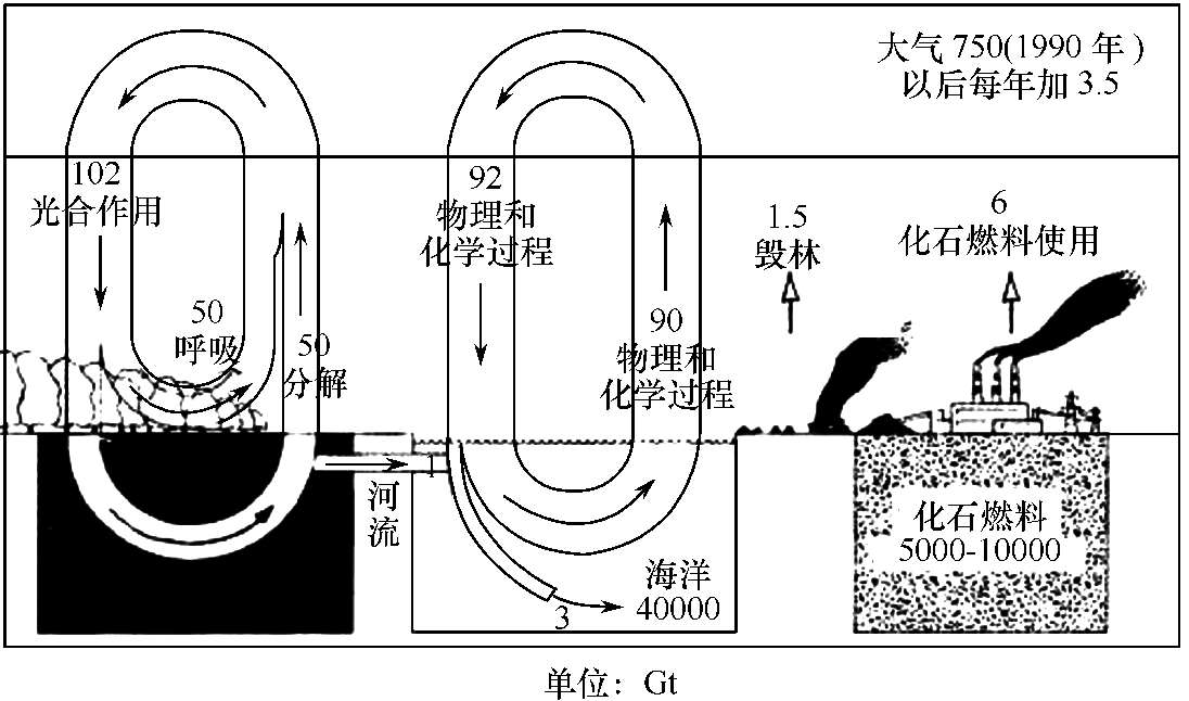 图2.2 地球上的碳库:生物圈、海洋和大气及其他碳库之间的CO 2 循环(曲建升等,2000)