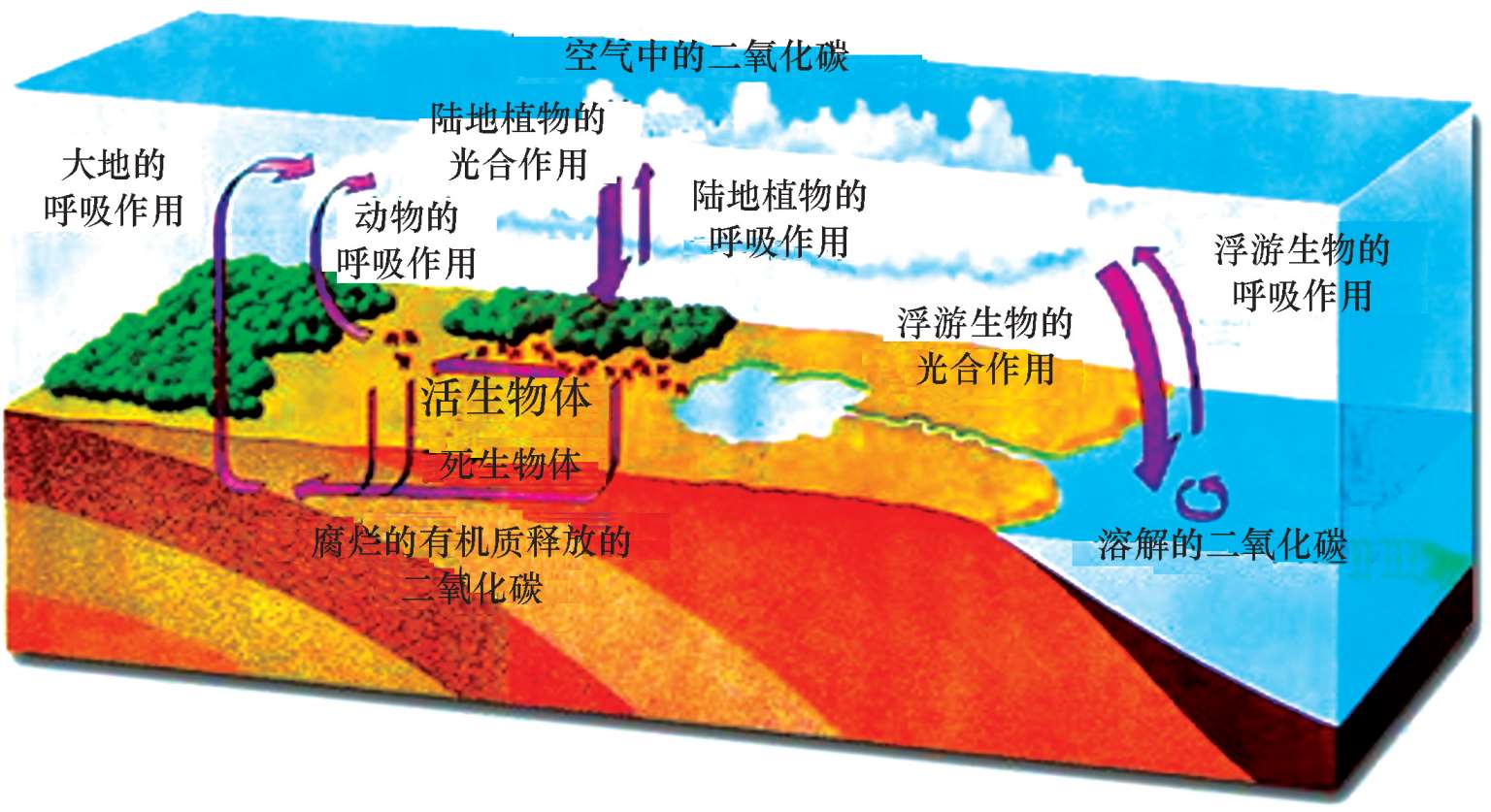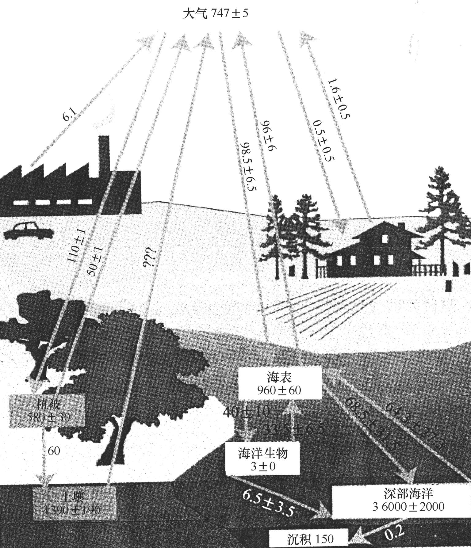 图3.1 CO 2 与陆地和海洋中动植物之间的交换(钱维宏,2009)