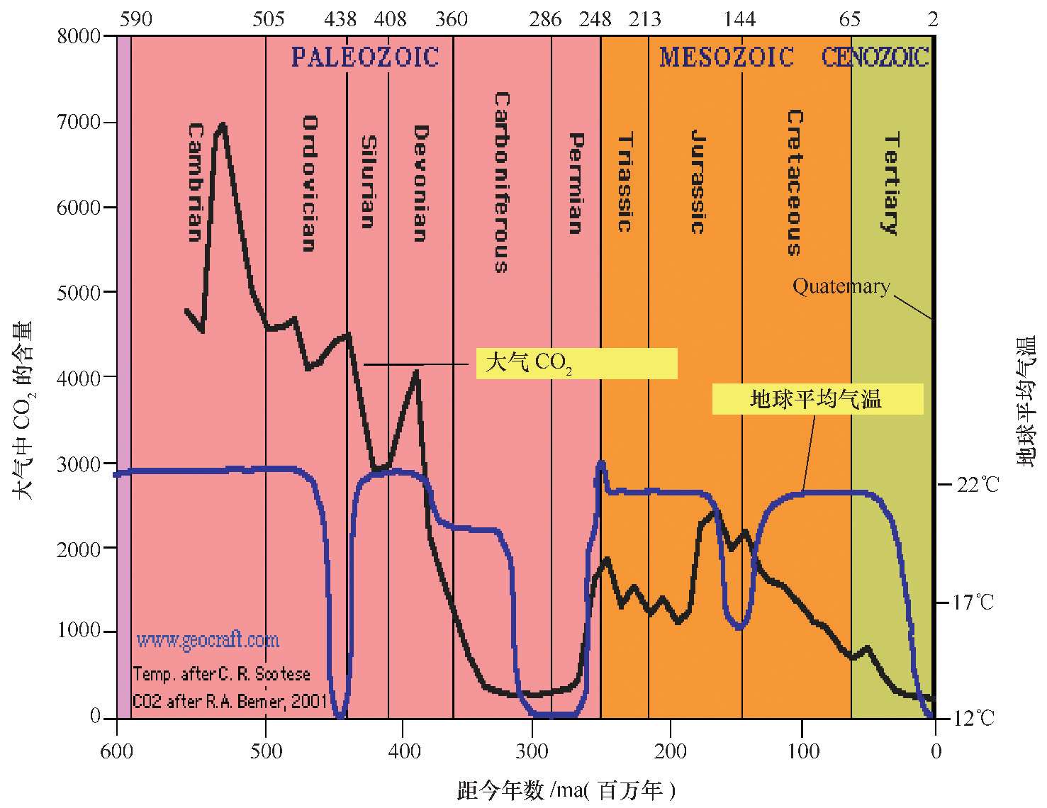 图4.2 地球各历史时期全球气温与CO 2 的关系(Berner,2001)