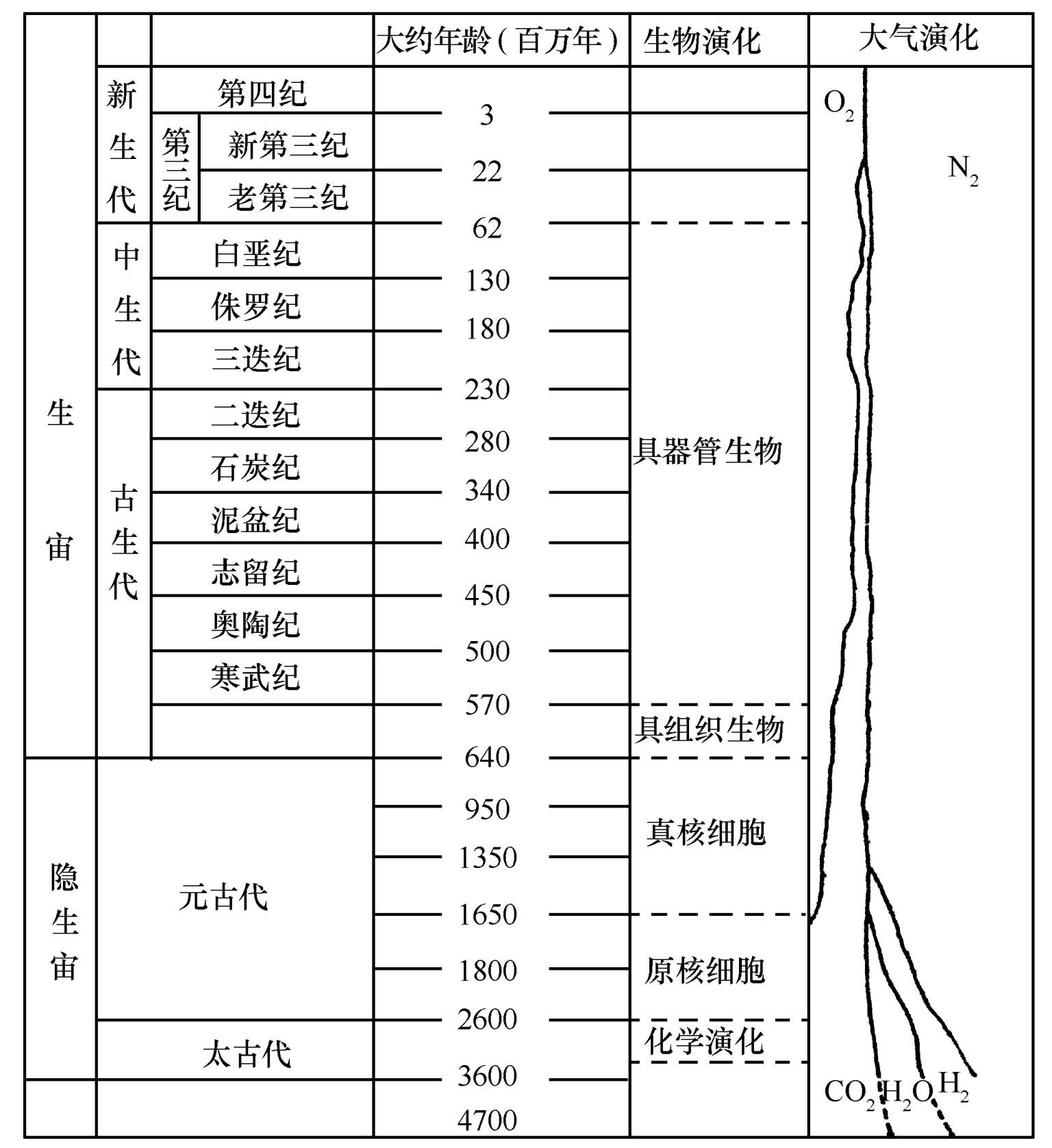 大气中的CO 2 含量在太古代(距今26亿年)前约为40%到了元古代末期(距今约6.4亿年)降到30%左右,到了古生代末(距今2.3亿年)下降到小于10 %,直到第三纪(距今2.2百万年)下降到1%左右,现在仅占0.03 %,成为稀有气体。