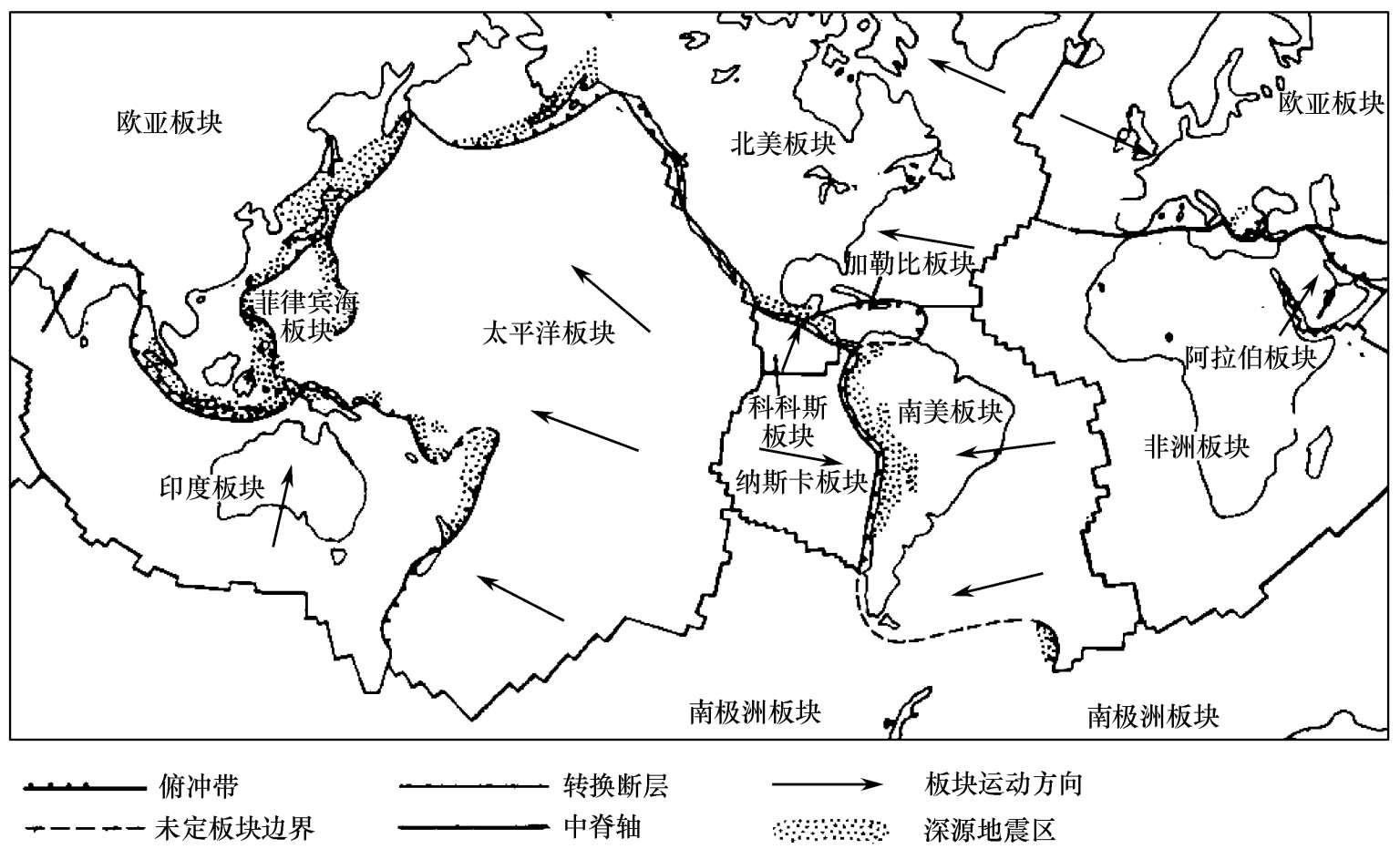 巨大的太平洋板块朝西北、西及北的海沟俯冲推移。太平洋板块与欧亚板块和印度板块的汇聚速率,在日本-汤加海沟一带达到最大,可达9 cm/a。汤加海沟以南,日本海沟以北,汇聚速率递减,向南至克马德克海沟,向北至阿留申海沟减至7 cm/a左右。在马里亚纳和菲律宾海沟附近,海沟出现分叉现象,其间夹着菲律宾海板块,由于间夹板块处于环太平洋汇聚挤压带范围内,故其间并未出现离散型边界。欧亚板块与次级菲律宾海板块之间相对运动的旋转极在日本北海道东北,它们的汇聚速率在日本九洲附近为3~4 cm/a,向南逐渐增大,至我国台湾以南增大到7 cm/a以上。太平洋板块东边侧,沿秘鲁—智利海沟,次级可可板块和纳兹卡板块与南美板块相互对冲(俯冲和仰冲),其汇聚速率也在9 cm/a以上。