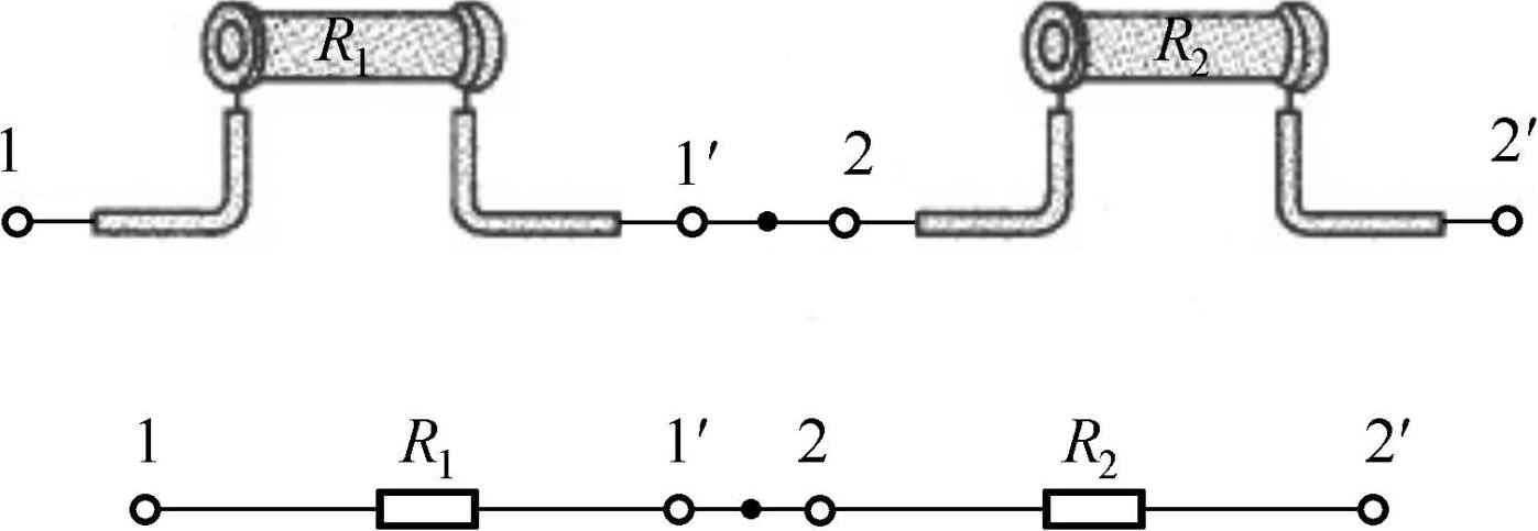 在电路中,把两个或两个以上的电阻依次连成一串,为电流提供唯一的一条路径,没有其他分支的电路连接方式,叫做电阻串联电路。如图 1-23 所示,电阻 R 1 和 R 2 串联。