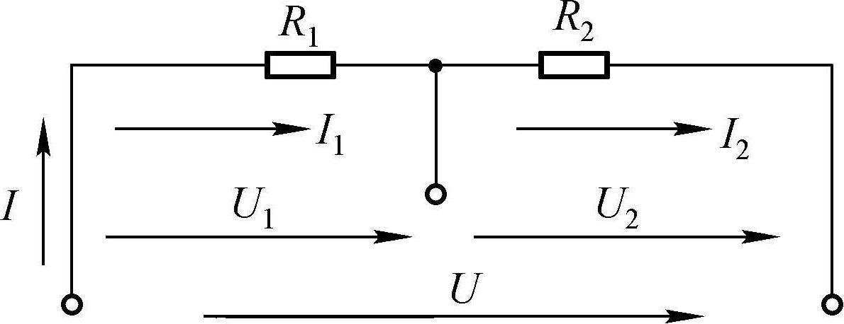如图 1 -25 所示,若已知两个串联电阻的总电压 U 及电阻 R 1 , R 2 ,则