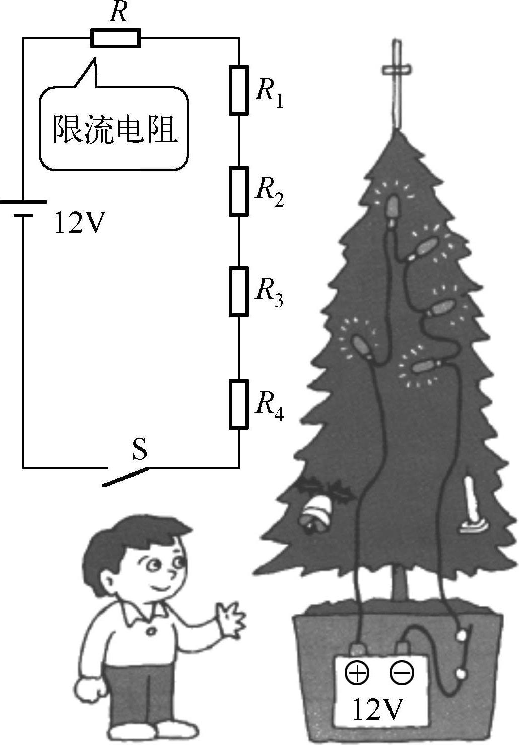 电阻串联的实例很多。例如,挂在圣诞树上的电灯泡,就是把电灯泡一个接一个地串联连接起来的,如图 1 -24 所示。