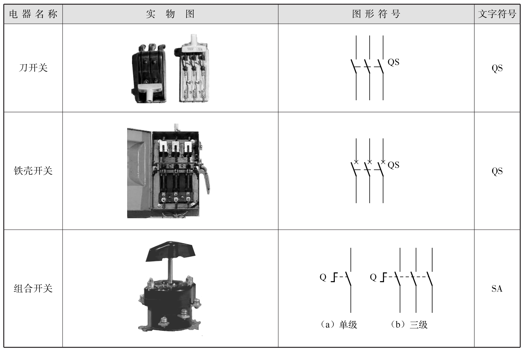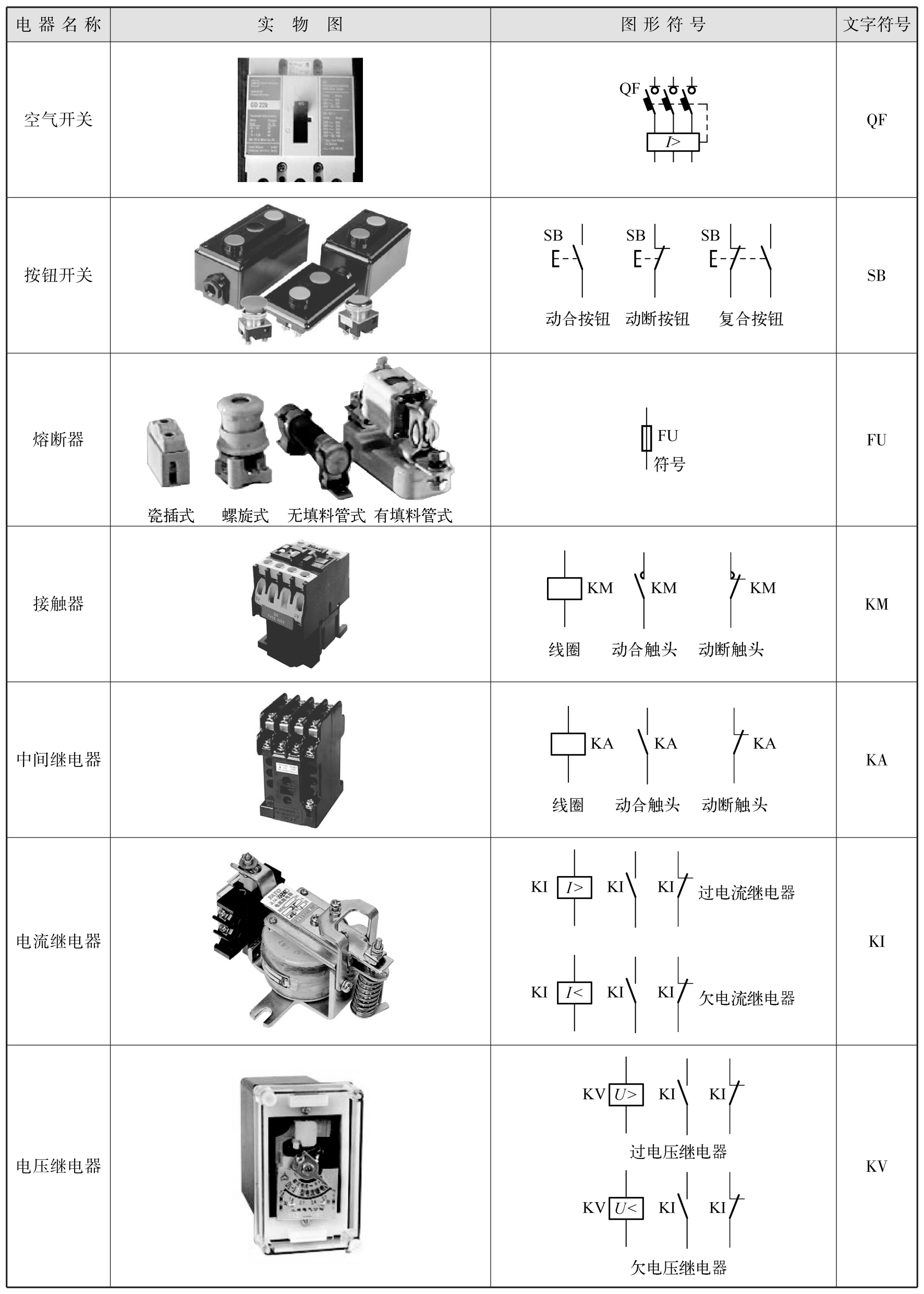 电气图中的电气符号包括图形符号和文字符号。电气图中涉及的电气符号很多,表1-1 列举了常用低压电器的电气符号。介绍这些电气符号旨在引导读者入门,为看图学习奠定基础。