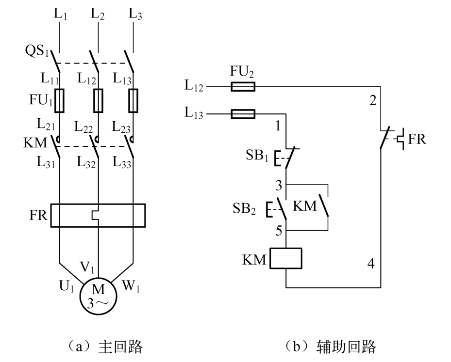 数字标号可用来区别同一文字标号回路中的不同线段。如图1-1(a)所示,在主回路中,三相交流电源用L 1 、L 2 、L 3 表示,经过开关QS 1 后,用L 11 、L 12 、L 13 标号,经过熔断器FU 1 后用L 21 、L 22 、L 23 表示等。