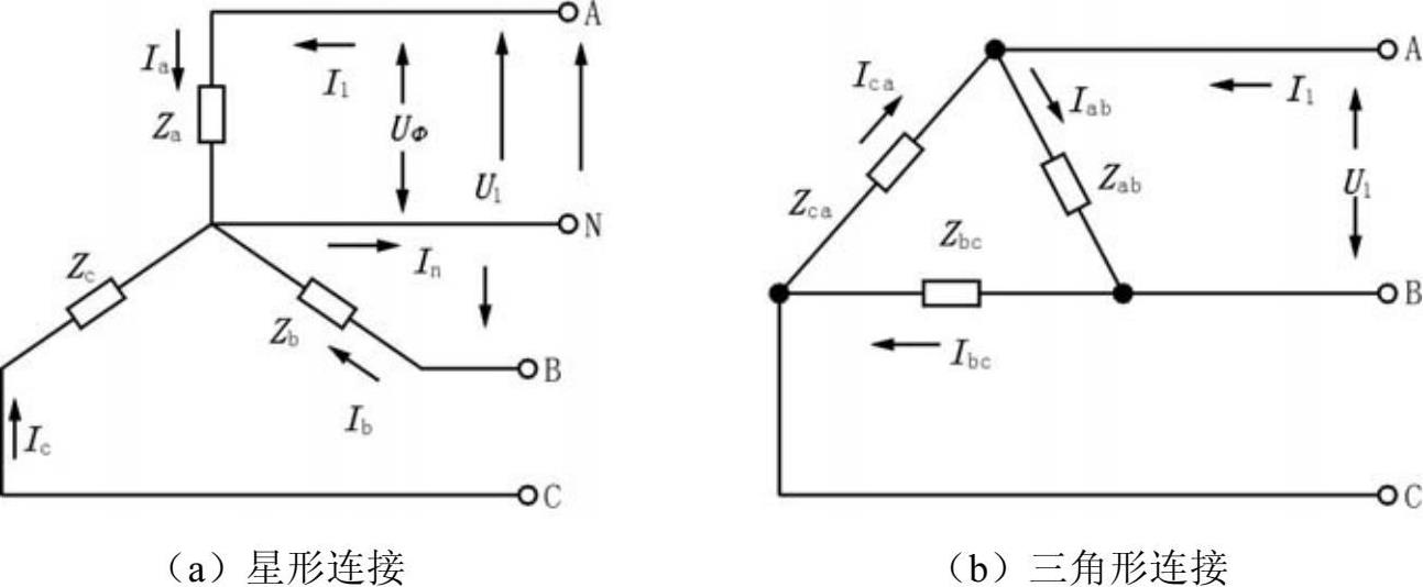 图2-4 三相交流电路负载的星形或三角形连接方式