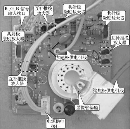 显像管电路主要包括末级视放电路、显像管电极供电电路及直流偏压电路等部分,主要作用是将电视信号处理电路送来的R、G、B信号进行放大,然后形成控制显像管的3个阴极的信号。图2-17为显像管电路。