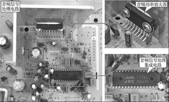 音频信号处理电路主要用来处理本机接收的音频信号和AV接口输入的音频信号,经该电路切换、处理和功率放大后,去驱动扬声器发声。该电路主要由音频信号处理集成电路、音频功率放大器、扬声器及外围元器件构成。图2-13为音频信号处理电路。