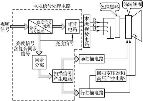 图2-19 电视信号处理电路与行/场扫描电路和显像管电路之间的关系