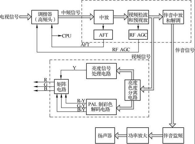 天线信号从天线插口输入,经过调谐器中的高频放大,混频和本振,将天线信号变成中频信号,被送到中频集成电路中进行中频放大、视频检波后,输出视频信号,同时从中取出第二伴音载频信号,经过伴音中放和伴音解调,从第二伴音载频上将伴音信号解调出来。