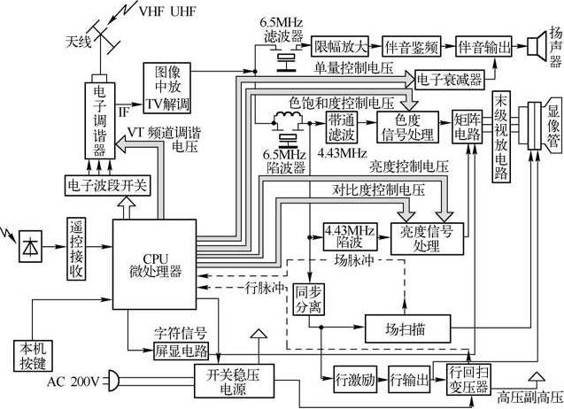 图2-10为彩色电视机的整机电路结构框图。从图中可以看出,彩色电视机的电路部分主要是由电视信号接收电路、电视信号处理电路、音频信号处理电路、行/场扫描电路、系统控制电路、开关电源电路及显像管电路等构成的。