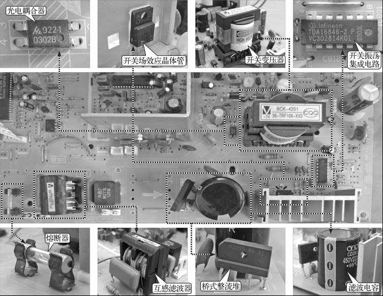 开关电源电路是为彩色电视机各单元电路和元器件提供工作电压的电路。通常,该电路中主要包括熔断器、互感滤波器、桥式整流堆、滤波电容、开关变压器、开关振荡集成电路、开关场效应晶体管、光电耦合器及各类电阻器、二极管等。图2-16为开关电源电路。