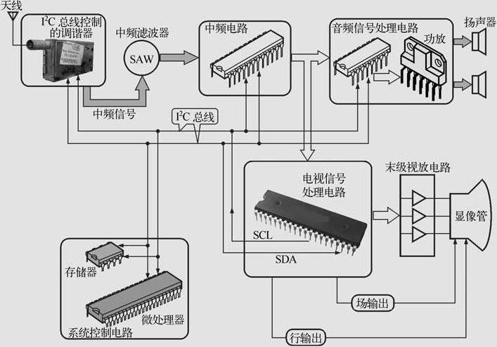 上述系统控制电路是以数字量变成模拟量的控制方式对整机电路进行控制的,除了这种控制方式外,许多彩色电视机还采用I 2 C总线对电视信号接收、处理及音频信号处理电路进行控制,如图2-21所示。