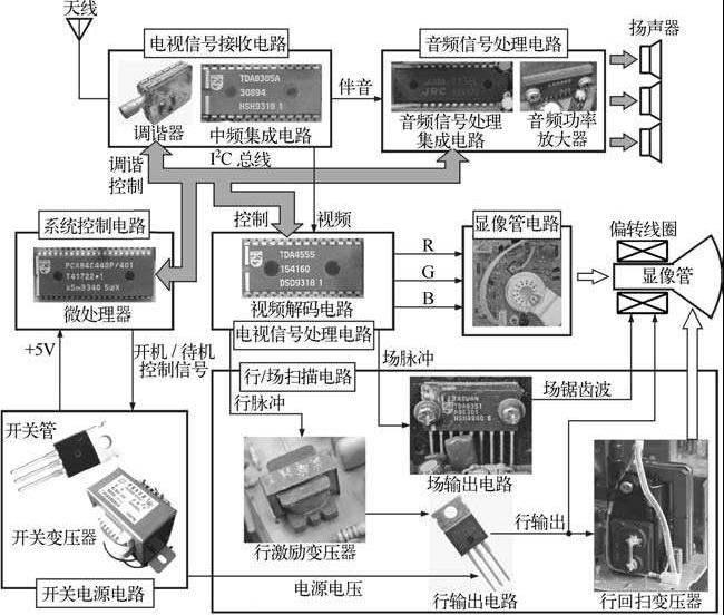 彩色电视机单元电路之间的连接关系可具体划分为电视信号接收电路与电视信号处理电路之间的关系、电视信号处理电路与行/场扫描电路和显像管电路之间的关系、系统控制电路与整机电路之间的关系。