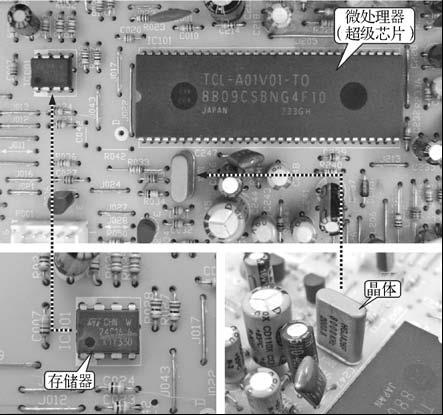 系统控制电路是对彩色电视机各个部分进行控制的电路,其核心部分是一个微处理器,简称CPU。此外该电路还包括晶体、存储器这两个重要元器件。系统控制电路通过识别人工指令(按键指令和遥控信号指令)对电视机的工作状态进行控制。图2-15为采用超级芯片的电视机系统控制电路。