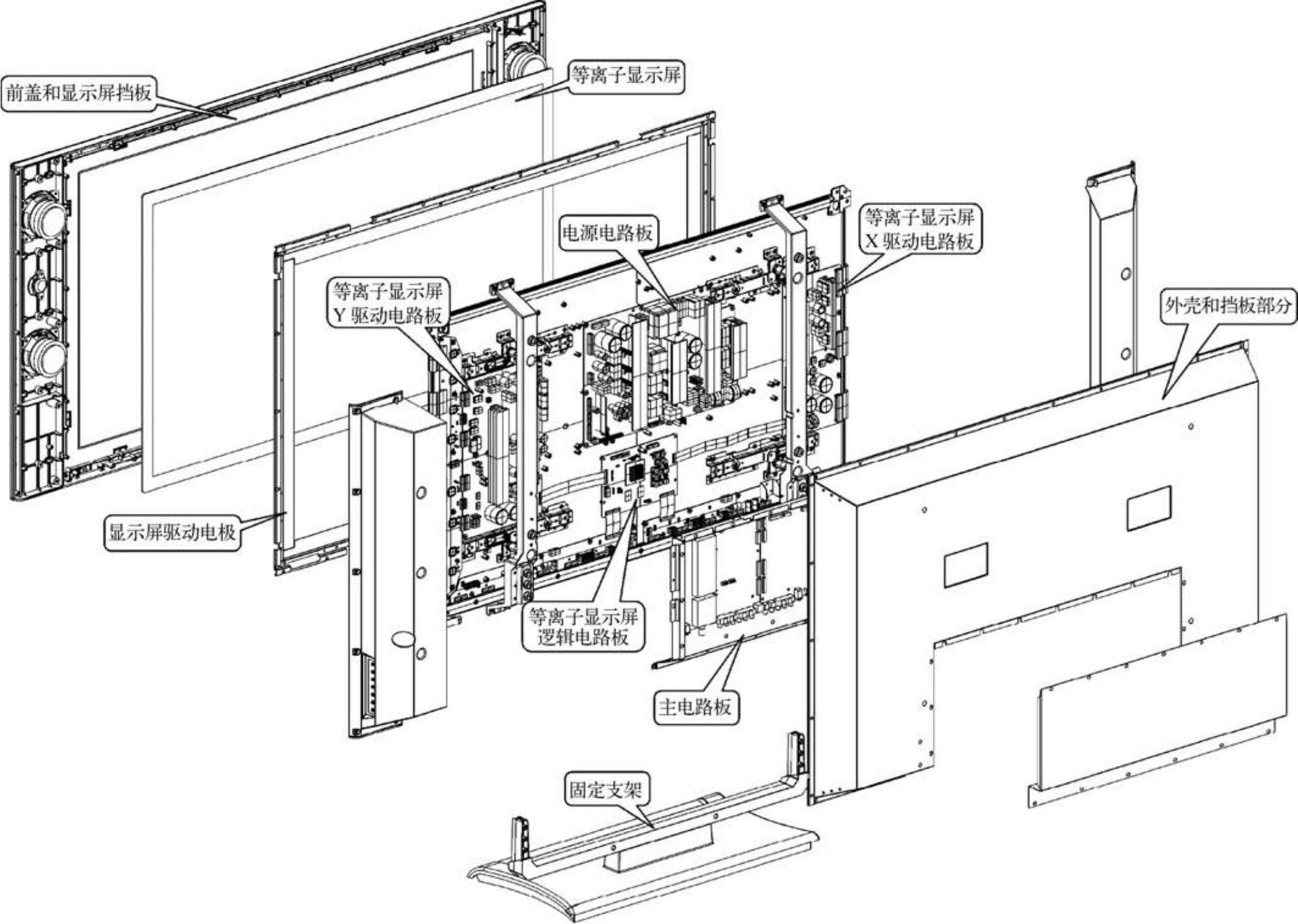 等离子平板电视机的整机是由等离子显示板组件、等离子显示屏驱动电路板、电源电路板、主电路板及外壳等构成的。图2-42为典型等离子电视机的整机分解图。虽然等离子电视机的型号有很多,但其结构基本相同。