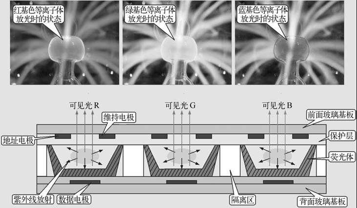 A:等离子平板电视机的显示屏之所以能显示多种颜色,是因为等离子显示板的每一个像素单元别可以分割为3个小的单元,如图2-45所示。在每一个相邻的小的单元内,分别涂有红、绿、蓝(R、G、B)三色荧光粉(所有的颜色都是由R、G、B三基色构成的),通过不同的电极来激发等离子体的显示单元,从而形成不同比例的R、G、B光线,合成后就形成了不同的颜色。