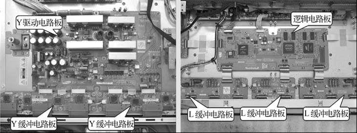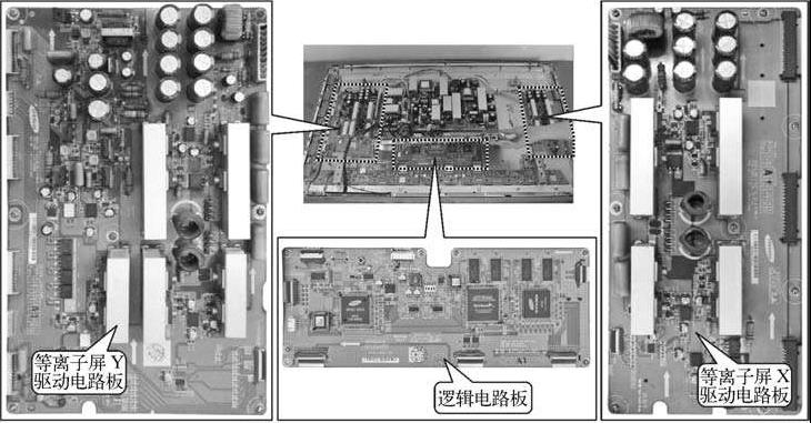 在等离子显示屏的四周设置有等离子显示屏驱动电路,用来为等离子显示屏提供电压和信号,也就是常说的X板(等离子屏X驱动电路板)、Y板(等离子屏Y驱动电路板)及逻辑电路板,如图2-46所示。