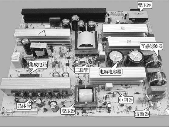 等离子电视机的电源电路将交流220V市电电压经滤波、整流、变换处理后变成多种直流电压,为整机的各部分电路提供电压。电源电路板是由多个分立式元器件组成的,如电阻器、变压器、电解电容器、电感器、二极管、晶体管及各个模块等。