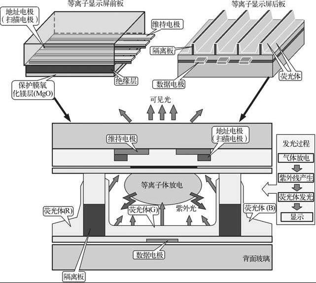 等离子显示板的每一个像素单元中都涂有荧光层,并充有惰性气体。其工作原理与日光灯很相似。在外加电压的作用下,气体呈现离子状态,并且放电,放电电子使荧光层发光,所有的放电单元都被制作在两块玻璃板之间。图2-44为等离子显示板的基本结构图。
