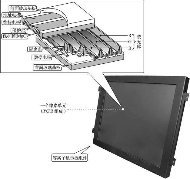 等离子平板电视机的主体就是等离子显示板。等离子显示板是由几百万个像素单元构成的。图2-43为典型的等离子显示板组件。