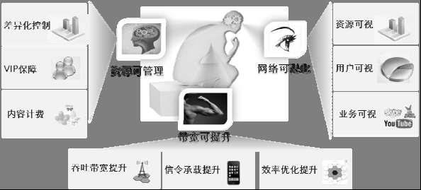 敏锐眼睛——用户行为感知:对资源、用户、业务进行监控,实现网络关键信息的可视化。智能大脑——资源动态调度:以提升资源利用率和体验为目标对资源进行差异化控制。强健身体——超宽带、泛接入:提供随时随地大带宽接入,抵抗信令冲击,效率优化提升。