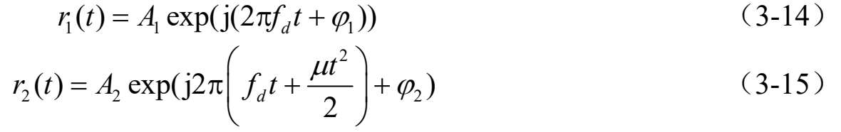 反辐射导弹的检测可以在时域或频域进行,但是由于反辐射导弹的回波比载机弱很多,且加上噪声的影响,在时域检测可靠性很差。在频域检测通常采用快速傅里叶变换来实现,利用反辐射导弹与载机之间的速度差异,通过其频谱上的差别对反辐射导弹进行检测。但是在反辐射导弹与载机没有完全分离时,反辐射导弹回波在发射初期的加速过程中是一个线性调频信号或者频带信号,载机回波通常近似是一个单频信号,假设ARM发射时速度为 v ,初始加速度为 a ,则其速度为 v + at 。对于普通窄带雷达,ARM发射初期的雷达回波信号形式如下: