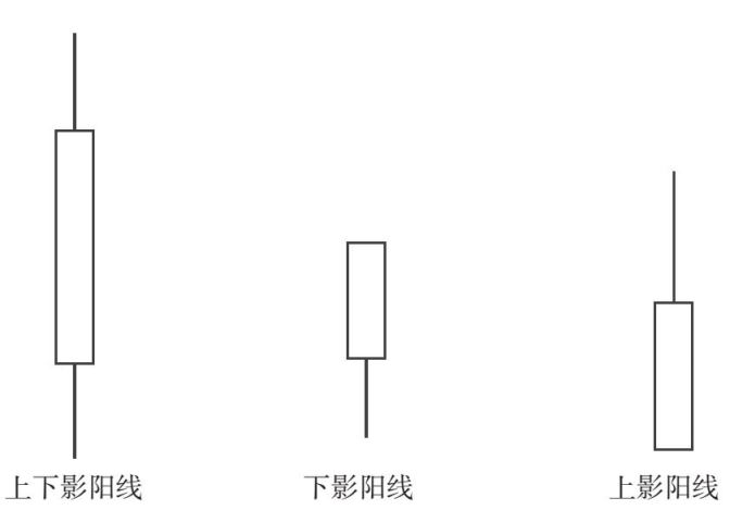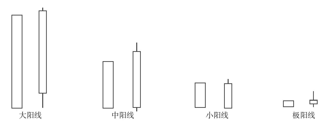 阳线可以分为很多种,如果按当天股价的涨幅来区分,可分为大阳线、中阳线、小阳线等,如图2-1所示;如果按当天股价的整体运行情况来分,又可以细分为无影阳线、上影阳线、下影阳线以及带上下影线的阳线,如图2-2所示。