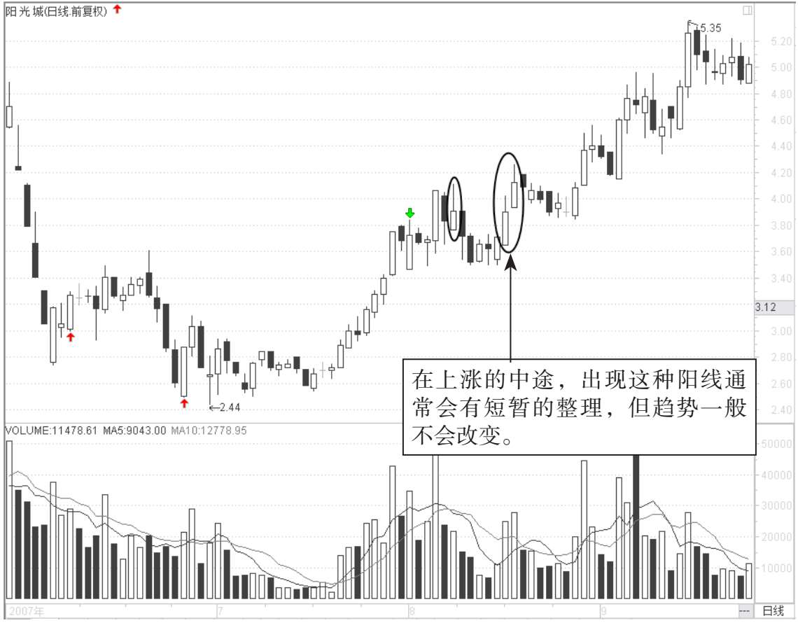 大阳线是指股价涨幅在5%以上的阳线,中阳线一般是指涨幅在3%~5%之间的阳线,而小阳线则是指股价涨幅在3%以下的阳线,极阳线通常是指在1%以下的阳线。它们预示着股价上涨的强度是不一样的,其强弱程度依次为大阳线、中阳线、小阳线、极阳线。需要指出的是,阳线并不一定代表当天的股价是上涨的。