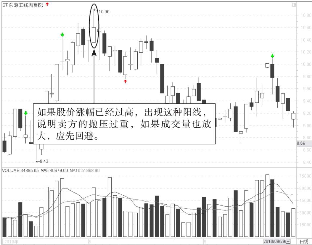 如果股价运行到重要的技术关口附近时出现这种K线,如60日线、半年线、年线附近,则表明该股前期在这个位置附近积累了大量的套牢盘。在这些套牢盘解套抛售的压力下,股价冲高受阻,要是做多力量不能及时起来反击的话,后市的股价很有可能会在解套盘的压力下出现回落整理,并以整理的形式来消化这附近的压力。其示意图如图2-11所示。