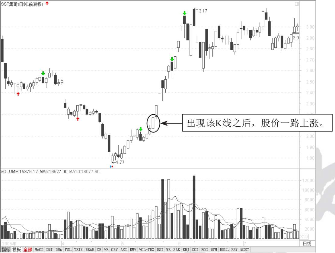 在股价上涨初期出现这种阳线,则表明买方力量在增强,买方占据了上风,预示后市股价将会继续上涨。投资者可放心参与,但后市不可贪高,最好是见利就收,落袋为安。如图2-5所示的SST集琦就是在上涨初期出现了无影阳线的走势。