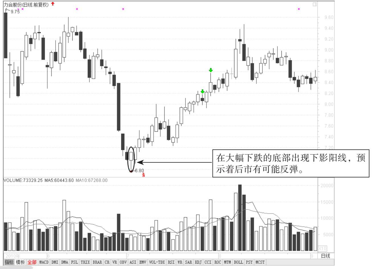 如图2-13所示的力合股份就是在底部区域出现的下影阳线。