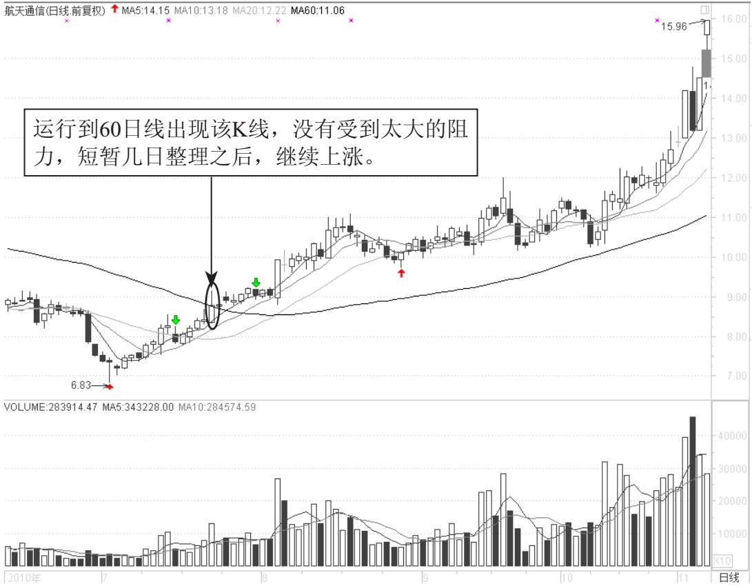 如果股价运行到重要的技术关口附近时(如60日均线、半年线以及年线),出现这种带上下影线的阳线的话,说明上有压力,下有支撑力。若上影线长于下影线,说明压力要大于支撑力;相反,若下影线长于上影线,说明支撑力要大于压力。但此时出现这种走势的后市股价,一般都会出现整理或者是回落的走势,除非股价第二天能够继续走强,并且收盘价在前一天的最高价之上,这样,后市股价就有可能继续走强。