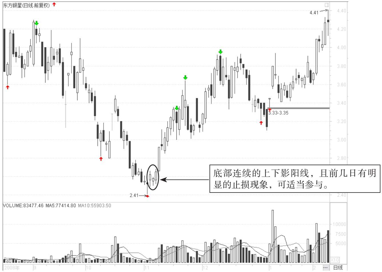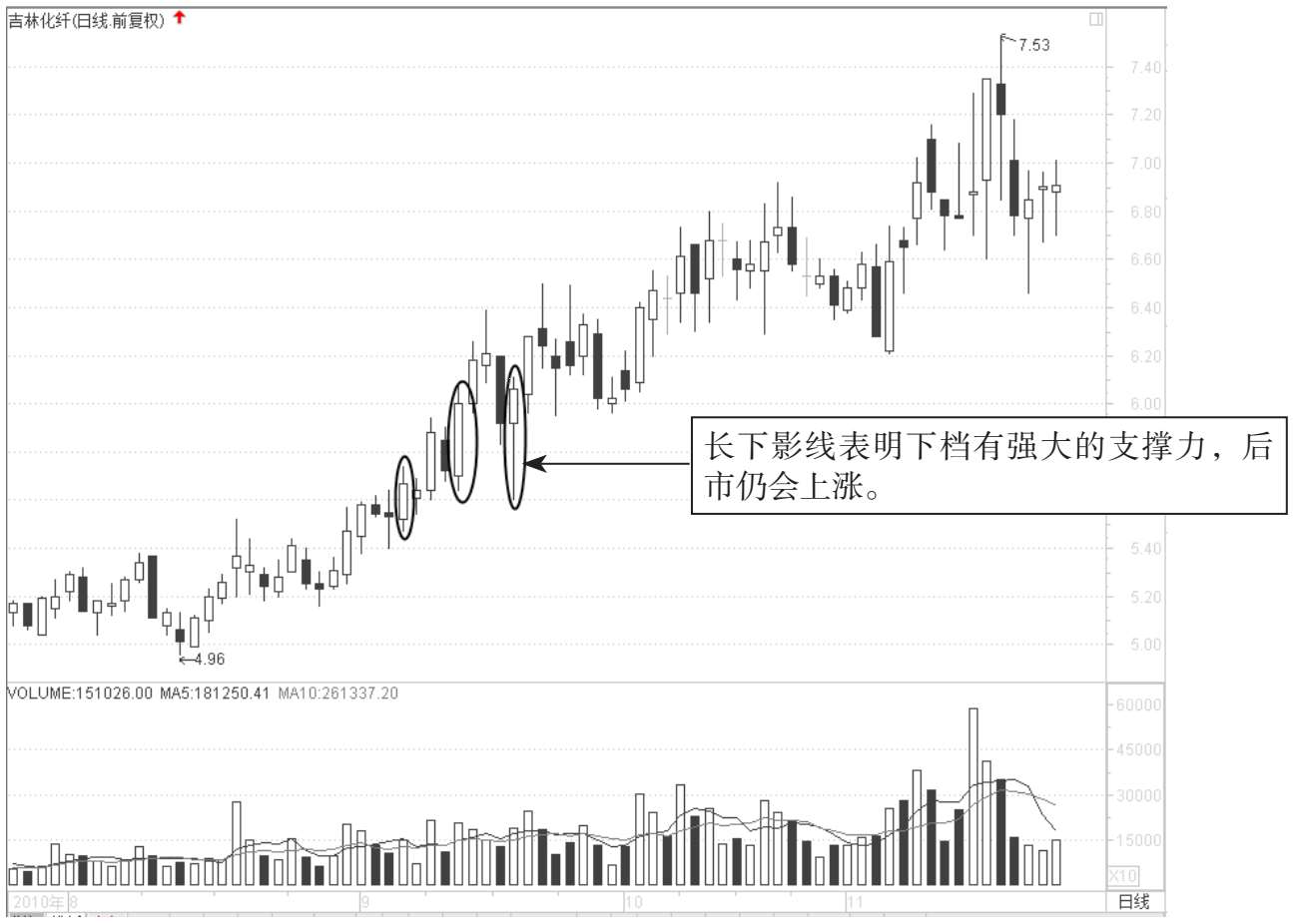 如图2-18所示的吉林化纤,在上涨的中途出现了若干上下影阳线,其中有一根下影线很长的阳线,说明下档支撑力度较强,后市将延续升势。