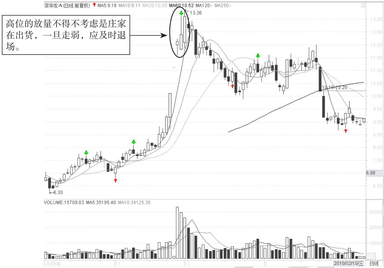 如图2-20所示的深华发A,股价在经过一波快速拉升之后突然放巨量,且之后呈现连续放量不涨的现象,随后股价开始回落。