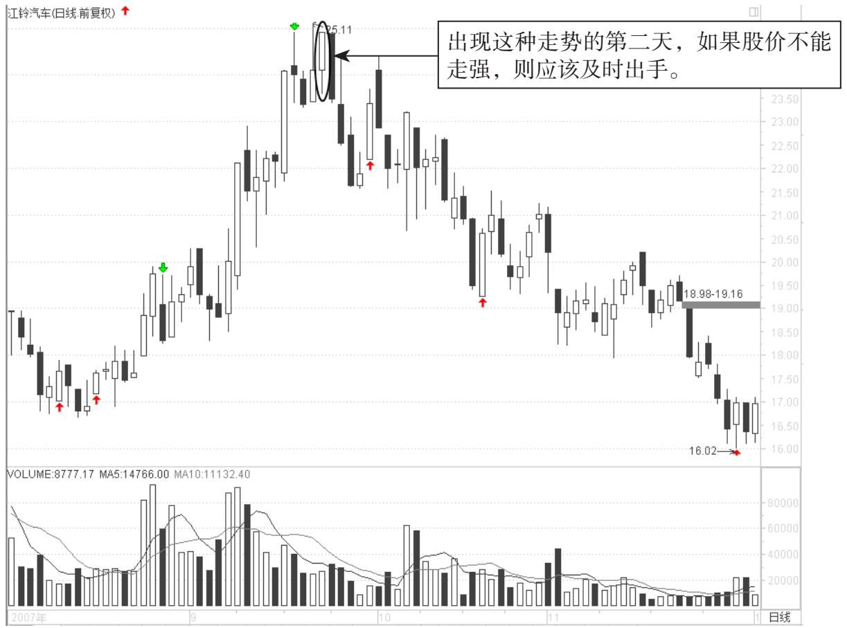 如图2-15所示的江铃汽车就是在股价大幅上涨之后出现这种走势的K线,随后股价转为跌势。