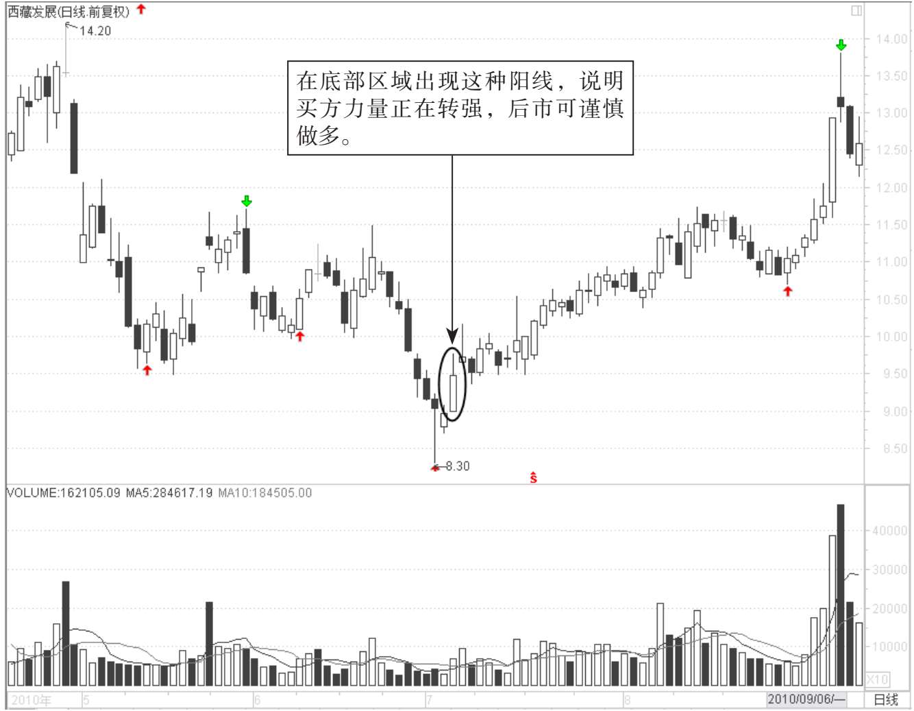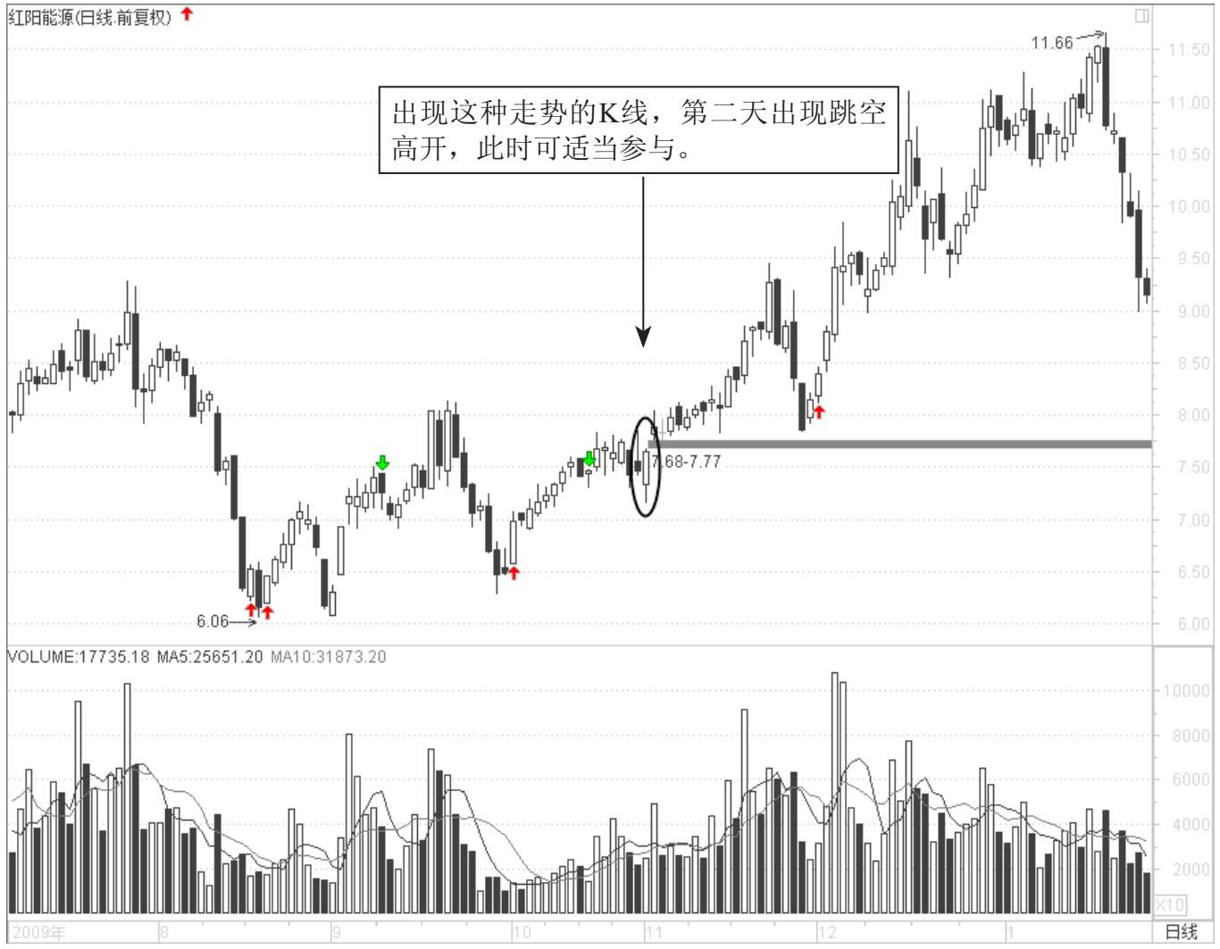 实战中,如果第二天股价能够继续走强,并且收出一根中阳线,可以适当地买进;如果第二天不能明显走强,则最好不要轻易入场操作。