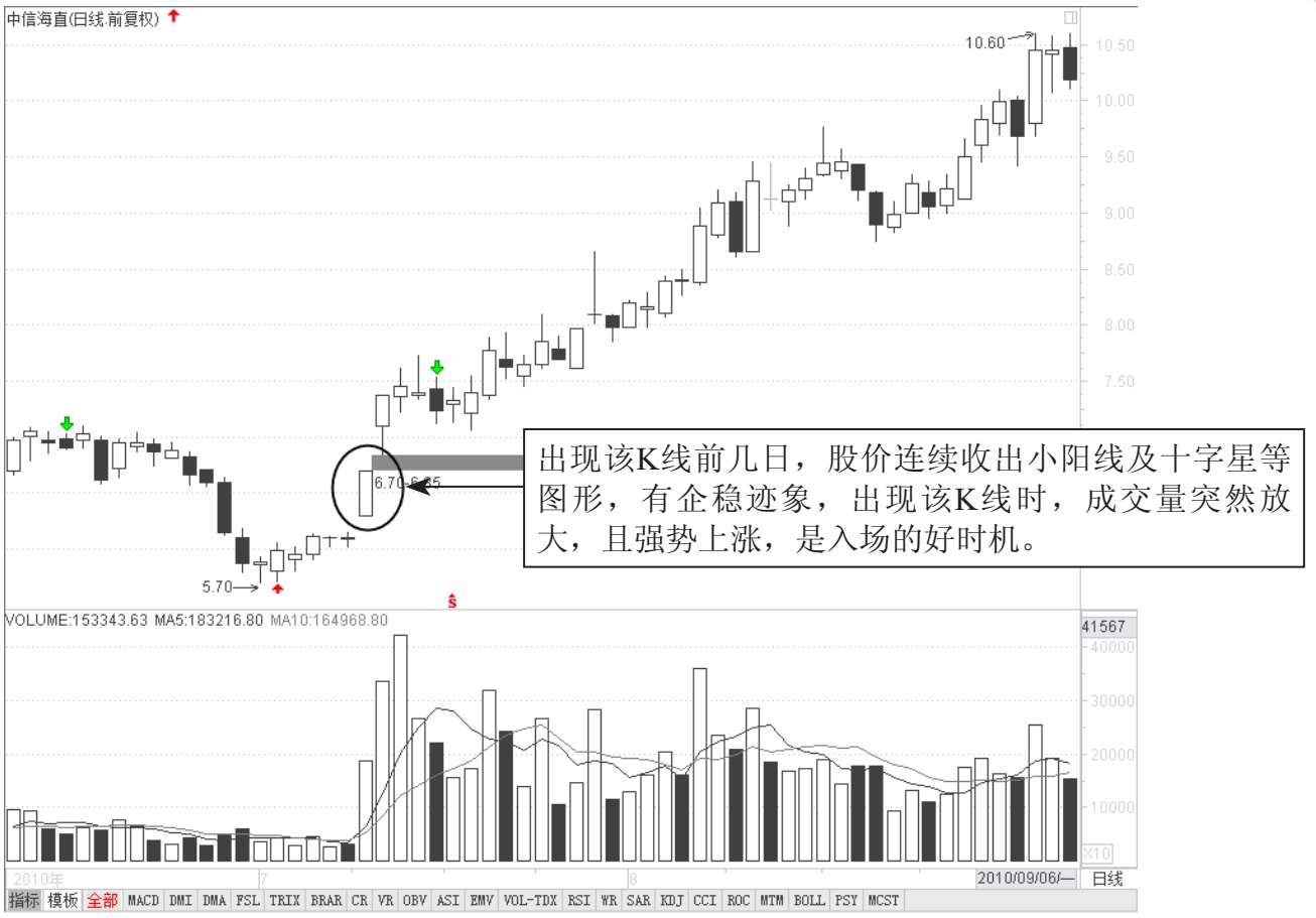 在长期下跌后的底部区域出现该K线,预示着股价很有可能会告别下跌行情,而即将迎来反弹甚至是反转行情。通常,阳线实体越长,说明后市股价出现反弹或是反转的可能性就越大。如图2-4所示的中信海直就是一个典型的底部区域出现无影阳线的例子。