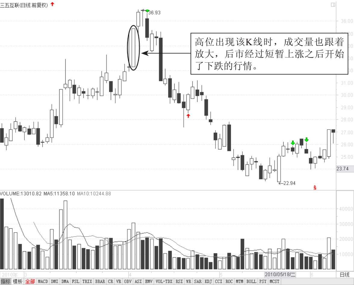 在大幅上涨后的高位出现这种K线就要注意了,特别是在放量的情况下。这说明做多力量在减弱,此时投资者要谨防庄家出货,一旦股价在第二天出现走弱,就要考虑卖出。
