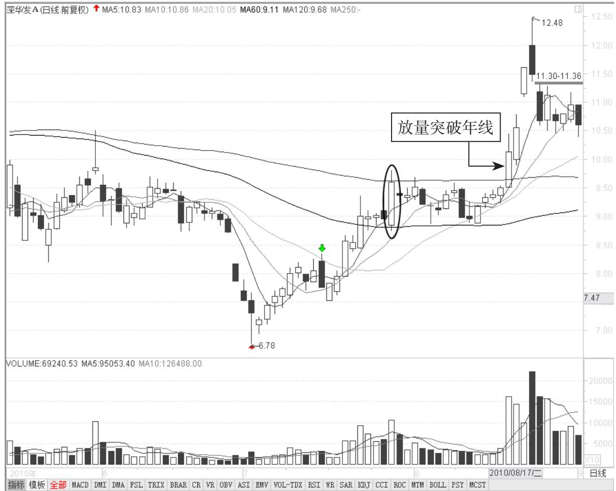如图2-19所示的深华发A,在上涨的过程中到达半年线的位置,受到一定的抛压,经过几日的整理之后,再次放量突破年线继续上涨。