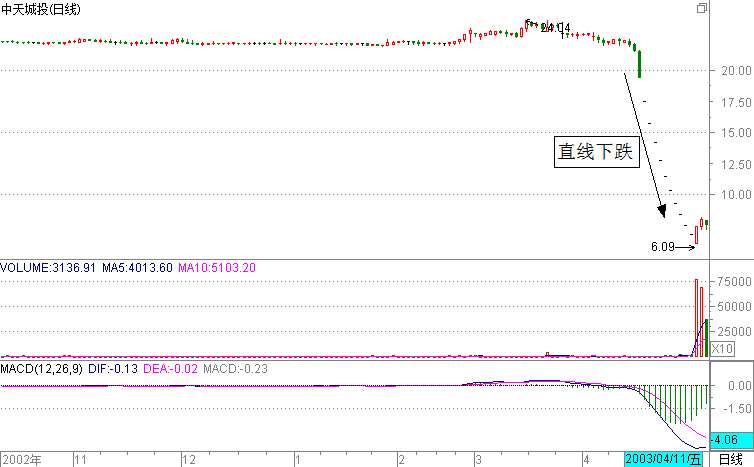 经过近10个月的横盘,庄家终于也坚持不住了,在2003年4月16日该股开始大跌封在跌停板位置。在大跌的这一天,仍然没有散户敢进场接货,于是在接下来的连续10个交易日都是跌停开盘,收出“一”字K线,股价从近20元跌到6元多,且这段时间的大跌并没有引来抄底盘,每天的换手率都很低,如图1-7所示。