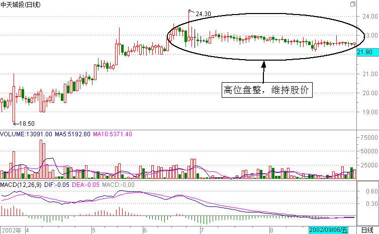 如图1-6所示是中天城投(000540)在2002年3月至2002年9月的K线图。在2002年时,该股名为世纪中天。在2000年1月11日,世纪兴业入主中天企业,并将该股改名为世纪中天(000540),从此开始了该股的黄金时代。首先是在2000年7月10送4.2股转增5.4股除权,随后股价开始疯涨,到年末复权价已经超过70元,全年涨幅在400%以上,成为当年的第一牛股。2001年上半年,世纪中天(000540)继续攀升。此后虽然大盘经历了将近20个月的暴跌,但是世纪中天(000540)的股价依然维持在高位。很明显有庄家在其中,由于大盘暴跌,没有多少散户敢入场接货,庄家出货困难,因此只好进行护盘,维持股价在高位。从图1-6中右侧的K线图可以看到,K线每天的实体都很小,都具有上下影线。这就是庄家在维持股价,没有散户跟风时的走势。