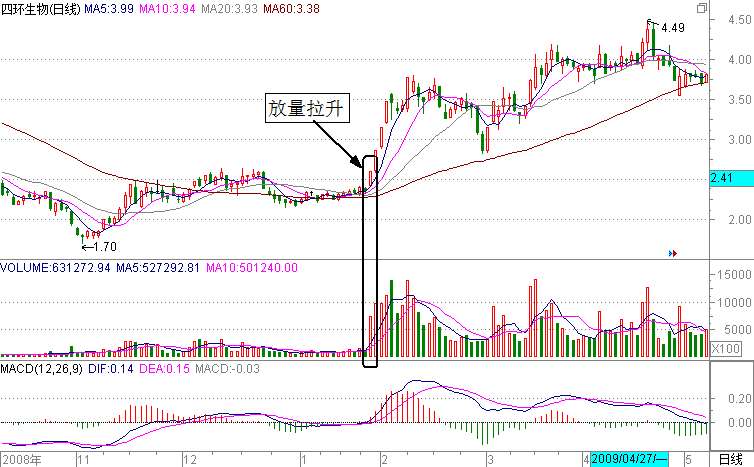 庄家建仓完毕后,拉升股价时希望吸引散户注意。这就给散户一个买入的机会,虽然买入的不是最低价,但能赶上主升浪。如图1-8所示是四环生物(000518) 2008年10月至2009年5月的K线图。2009年1月22日,该股换手率达到8.16%,比前一交易日的换手率1.14%放大7倍多,股价也被拉上涨停。这就给散户提供了入场的机会,这时的收盘价2.60元还处于低位,在第二天2.61元开盘后散户就可买入,风险不大。