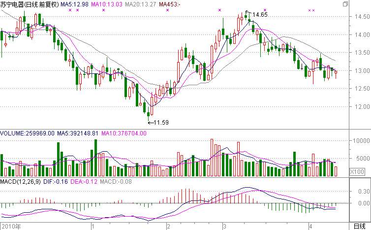 当股票价格位于不同区域时,股民看多或看空的态度也会发生转变。例如,苏宁电器(002024)近期的K线图如图2-2所示,该股近期最低价为11.59元,最高价为14.65元。由于该股今年涨幅很小,近期的最低价11.59元也是近几年的最低价,而该股的基本面并没有大的变化。假设有1000位股民在关注该股,当该股的价格在现在的价位(约13元)附近时,可能只有约70%的参与者认为价格已不会再下跌了,现在买入以后会出现更高的价格,而30%左右的股民认为该股价还将下跌,继续观望。当70%看多的股民开始买入该股时,股价开始上升,当股价涨到一定程度(假设为15元)时,股价已上升了约15%,起先买入的人中可能有30%的人认为价格不会继续上升,因此会卖出股票,而最初看跌的30%的股民中可能有10%改变了观点,认为价格还会上升,这时,价格产生了瞬间的不平衡,卖出的有30%的股民,买入的只有10%的股民,股票价格就可能会下跌。