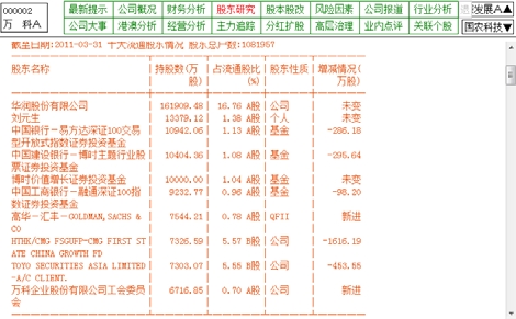 如图1-1所示是万科A(000002)2011年一季报时十大流通股东的持股情况。从图中可以看出,持有万科A(000002)的前十大流通股东有公司、个人、基金等不同身份的股东。通常,庄家坐庄时会动用很多账号,一般会隐藏自己,尽量不在季报的前十大流通股东中露面。